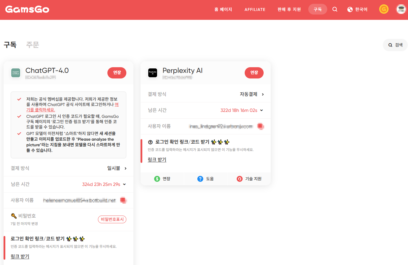 - 계정을 공유하는 방식이라 가끔씩은 로그인이 해제될 때가 있지만, 갬스고 홈페이지에서 바로 해결 가능해요.