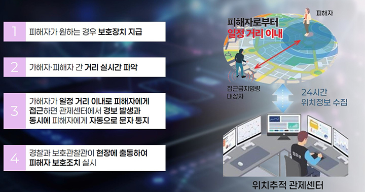 - 위치 추적 및 경보 발생: 가해자가 피해자 반경 2km 이내로 접근하면 관제센터에 경보가 울리고, 피해자의 휴대전화로 자동 문자 알림이 발송됩니다.